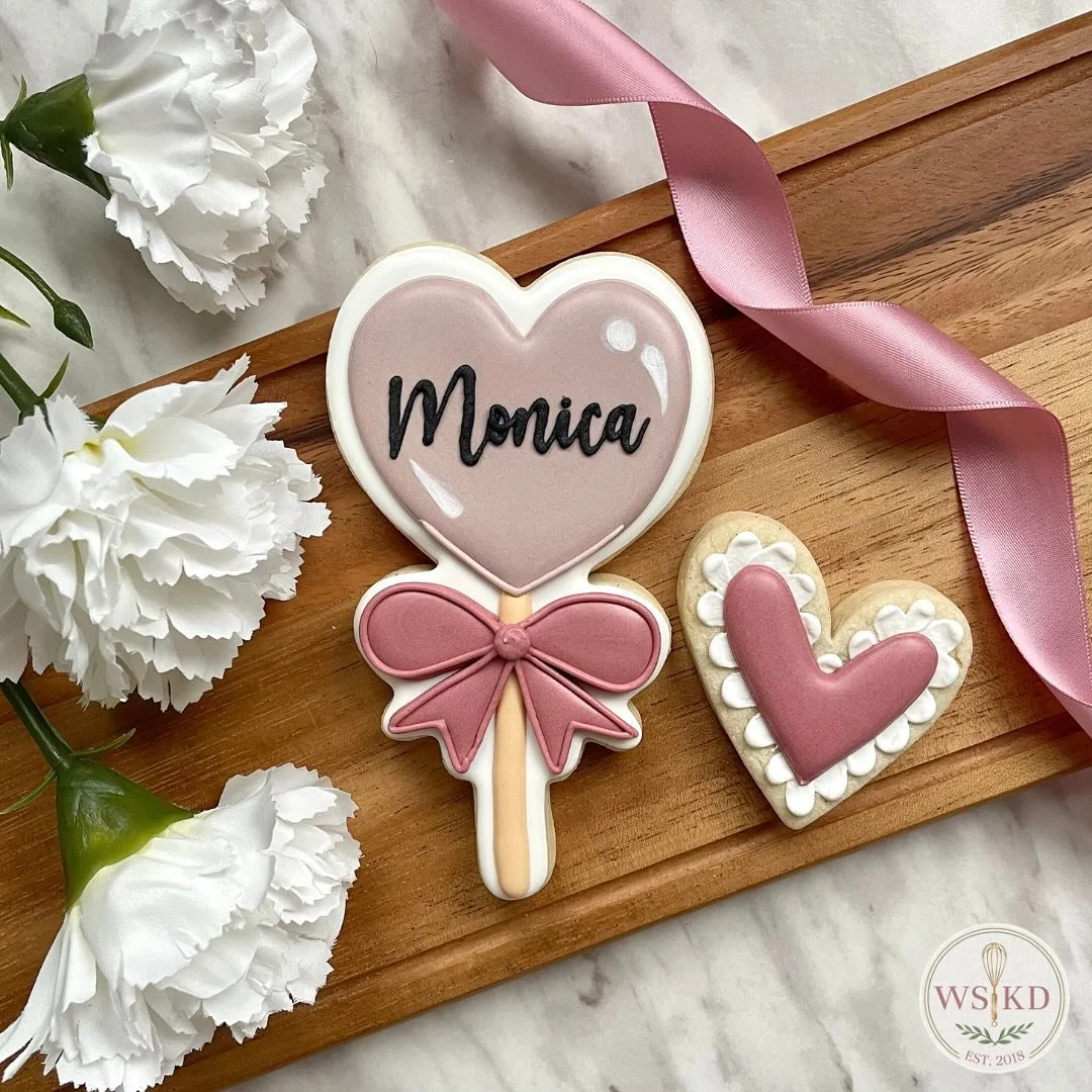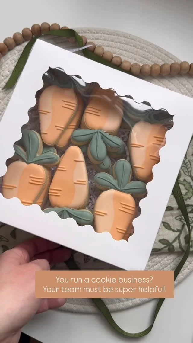 Each cookie is baked, decorated, and packaged by hand using my signature vanilla sugar cookie recipe.
